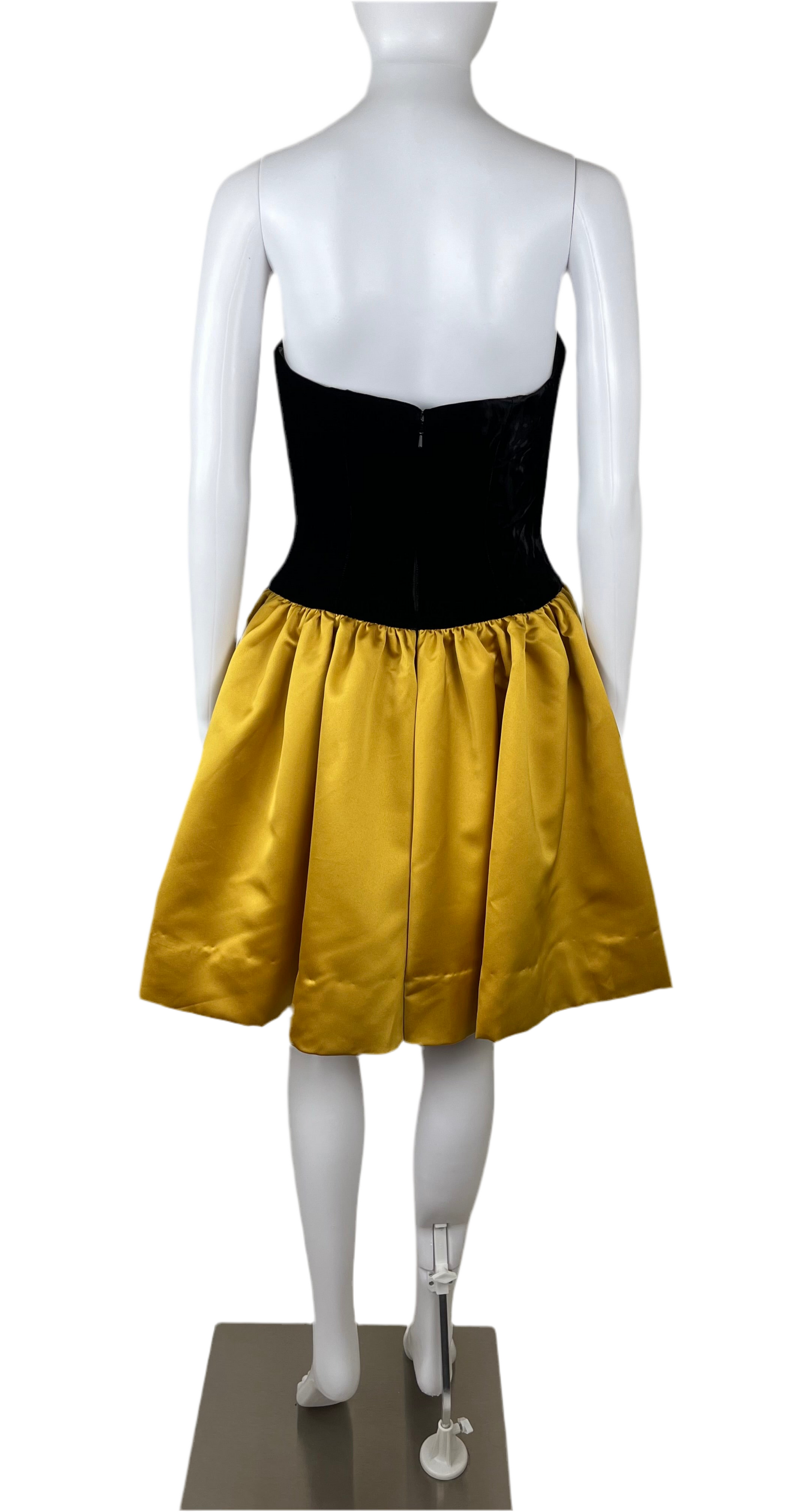 This gorgeous vintage Bob Mackie color blocked evening dress features a boned velvet bodice and a full gathered golden satin skirt. The velvet bodice has intricate geometric hand beading that combines black and gold sequins and beads. In the tradition of couture dressmaking the inner construction includes a grosgrain waistband to secure the boned bodice to the body.