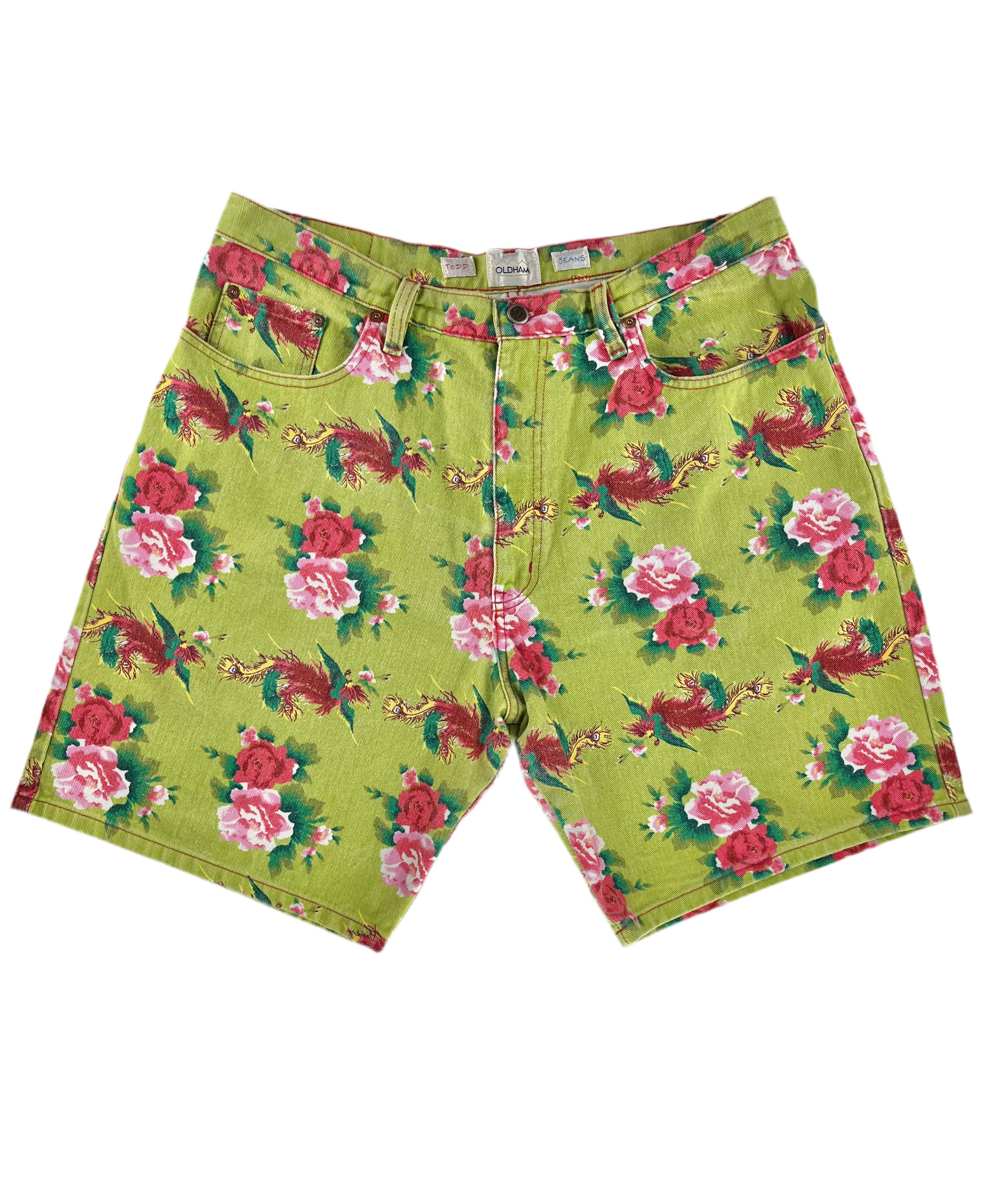 Todd Oldham Jeans Spring / Summer 1995 Men’s Floral Printed Shorts. This colorful floral and feather print design was seen on the runway and photographed in editorials for Vogue magazine